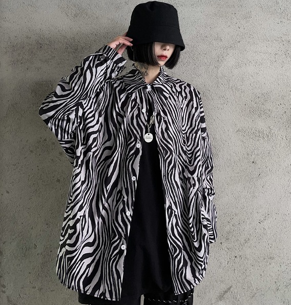 全2色 ブラウス シャツ 長袖 切り替え バイカラー 配色 体型カバー レオパード柄 ヒョウ柄 ヴィンテージ風 レトロ調 原宿系ファッション 韓国風ダンス 衣装 ヒップホップ HIPHOP 個性 奇抜