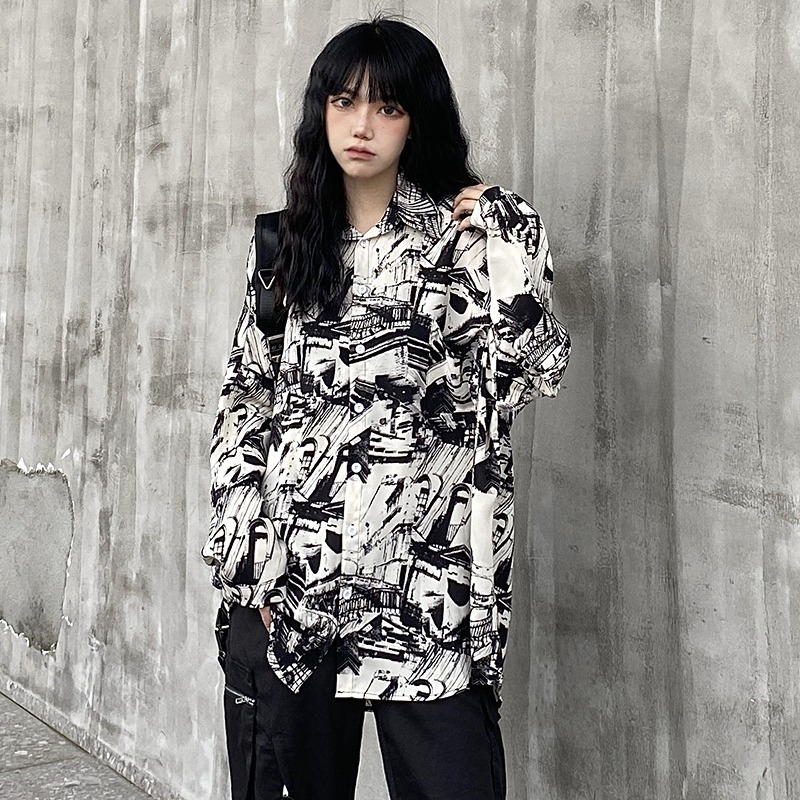 ブラウス シャツ 長袖 切り替え バイカラー 配色 プリント ユニセックス 男女兼用 体型カバー 原宿系ファッション 韓国風 ダンス衣装 POP カワ 個性 奇抜 かわいい 青文字系 トップス レディ
