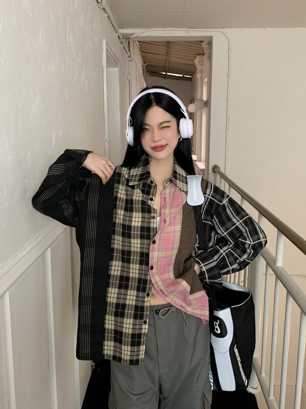 ブラウス シャツ ショート丈 長袖 切り替え バイカラー 配色 チェック柄 格子柄 体型カバー 原宿系ファッション 韓国風 ダンス衣装 POP カワ 個性 奇抜 かわいい 青文字系 トップス レディー