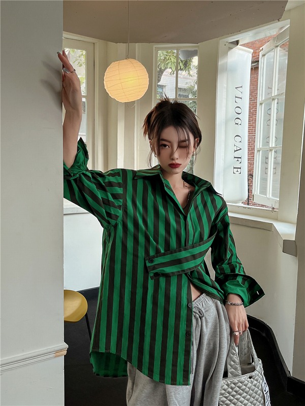 全2色 ブラウス シャツ 切り替え バイカラー 配色 体型カバー 長袖 ボーダー柄 ストライプ柄 ライン 原宿系ファッション 韓国風 ダンス衣装 カワ 個性 奇抜 かわいい 青文字系 トップス