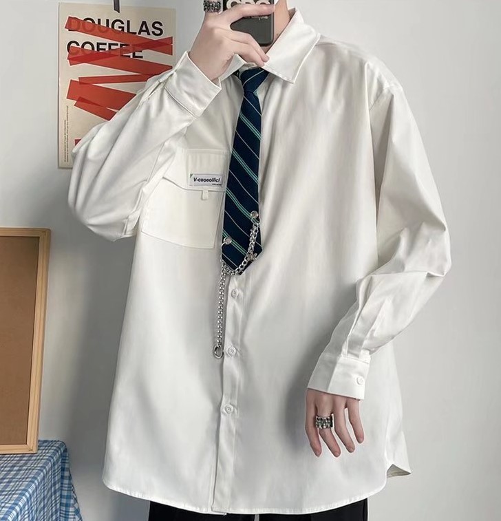 チェーン+ネクタイ付シャツ3色ブラウス長袖トップス無地シンプルポケットロゴ白ホワイト黒ブラック青ブルーダンス衣装ヒップホップレディースメンズガールズストリート韓国奇抜派手おしゃれ大きいサイ