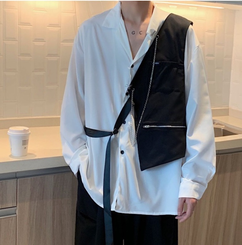 ベスト+チェーン付長袖ブラウスシャツトップスカットソー白ホワイト黒ブラックダンス衣装ヒップホップHIPHOPレディースメンズガールスストリート個性的奇抜派手シンプル無地韓国大きいサイズゆったり服上スケ