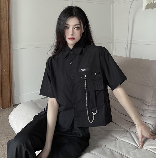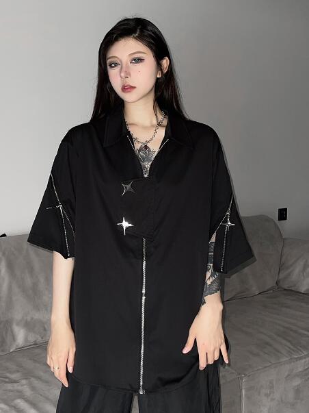 モード系シャツ 半袖 チェーン ビッグシルエット ゆめかわいい 奇抜 派手前開き トップス ダンス 衣装 ヒップホップ コスチューム 韓国ファッション 大きいサイズ 個性的 服 原宿系オーバーサイズ