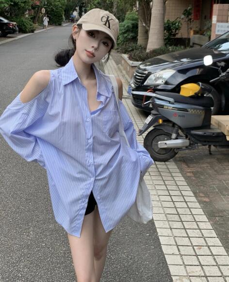 シャツブラウストップスカットソー長袖前開きゆったりブルー肩出し大きいサイズダンス衣装ヒップホップHIPHOPレディースガールズ大人韓国奇抜派手おしゃれ
