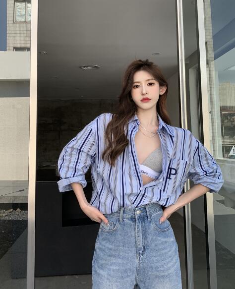 2色シャツブラウストップスカットソー長袖前開きゆったりブルーグリーン刺繍ロゴ大きいサイズダンス衣装ヒップホップレディースガールズ大人韓国レトロ奇抜派手おしゃれ