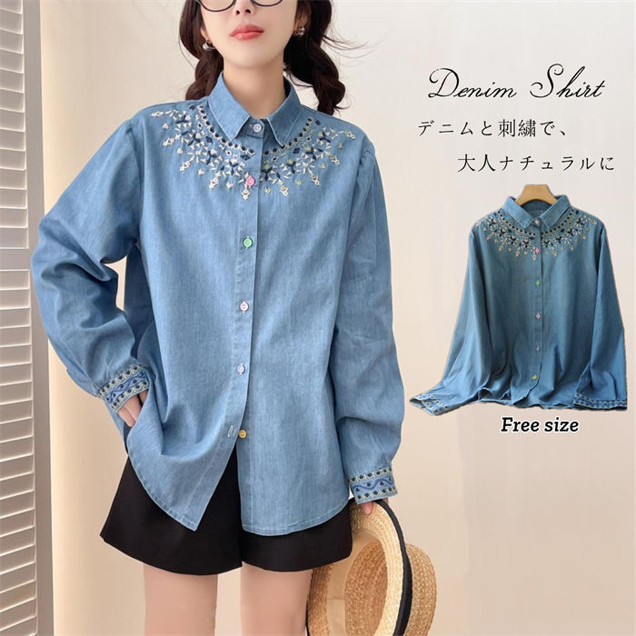 シャツ ブラウス デニム レディース 刺繍 花柄 長袖シャツ チュニック 春 デニムシャツ トップス シャツブラウス デニム 花柄シャツ
