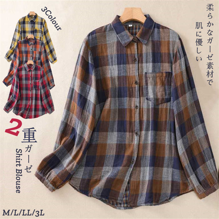 ガーゼ シャツ ダブルガーゼ レディース チェック柄 2重ガーゼ ブラウス 綿 チュニック シャツブラウス 綿100% ガーゼシャツ