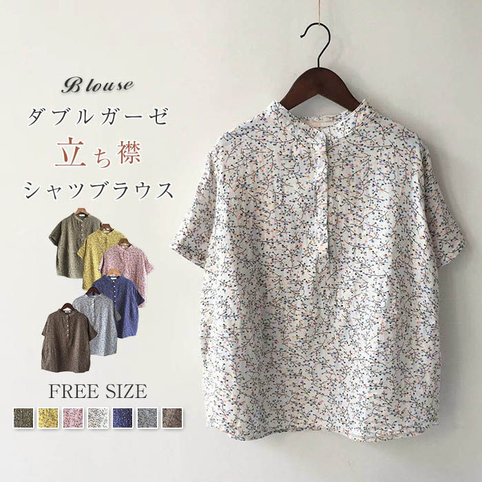 ダブルガーゼ シャツ ブラウス シャツブラウス レディース 夏 半袖 花柄 立ち襟 トップス 2重ガーゼ カジュアル 総柄 大きいサイズ