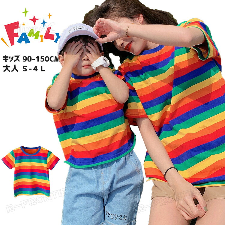 親子 ペアtシャツ ペアルック 親子 子供 tシャツ コーデ リンクコーデ 親子コーデ パパ ママ 男の子 女の子 ストライプ 虹色tシャツ 赤ちゃん ベビー服 子供服 半袖 Tシャツ