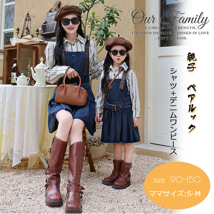 親子ペアルック 秋物 縞柄シャツ 長袖 デニムワンピース ママと娘 お出かけ 普段着 ご家族旅行キッズ ベビー マタニティ キッズファッション 親子ペアルック