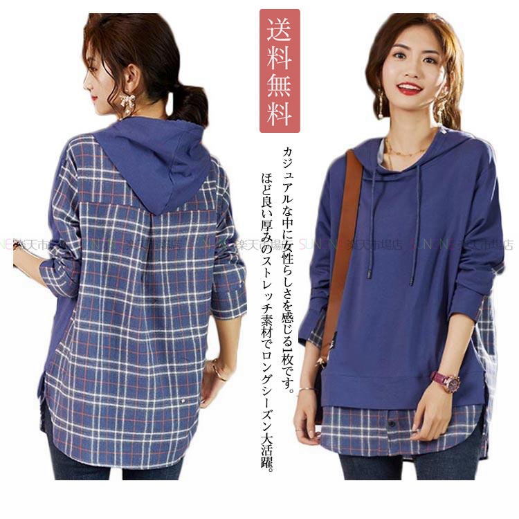 パーカー レディース レイヤード風 チェック 重ね着風 フード付き ファッション トップス プルオーバー カジュアル 可愛い 春 プルオーバーパーカー レディース韓国