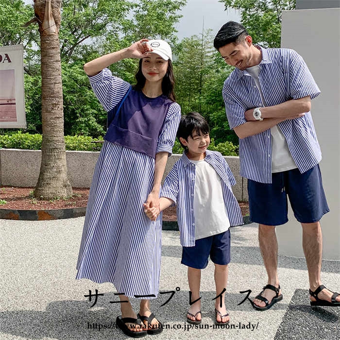 ストライプ柄 半袖シャツ リンクコーデ 親子お揃い 親子ペア ショートパンツ 親子セット ワンピース シャツ ペアルック
