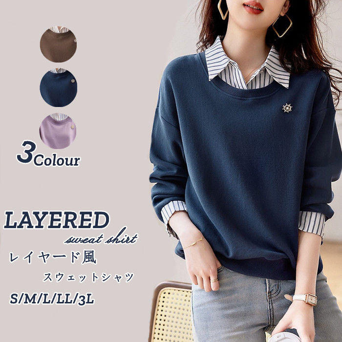 レイヤード風 トレーナー スウェット トップス 長袖 レディース シャツブラウス シャツ シャツ レイヤードトップス シャツ襟 折り襟 ゆったり