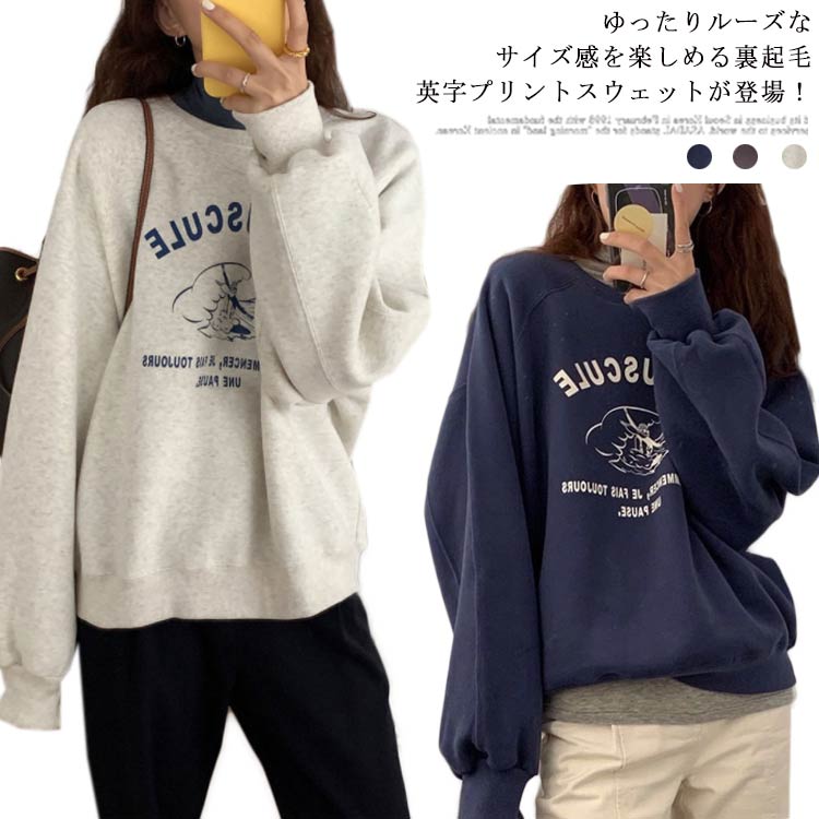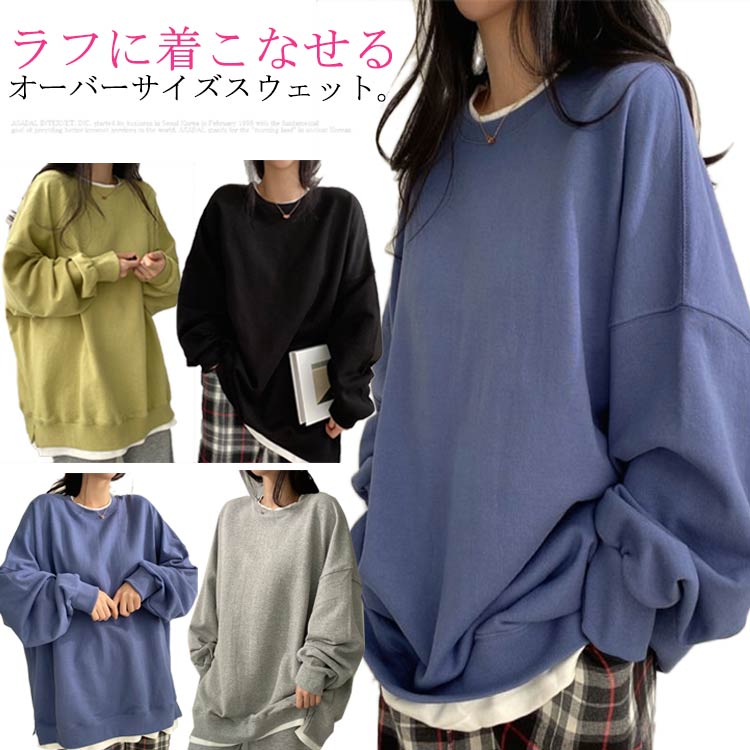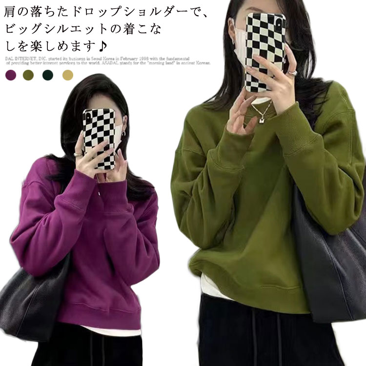 丸ネック無地大きめ 長袖トップス韓国クルーネック 丸ネック無地大きめ トレーナーレディース裏起毛重ね着風スウェット