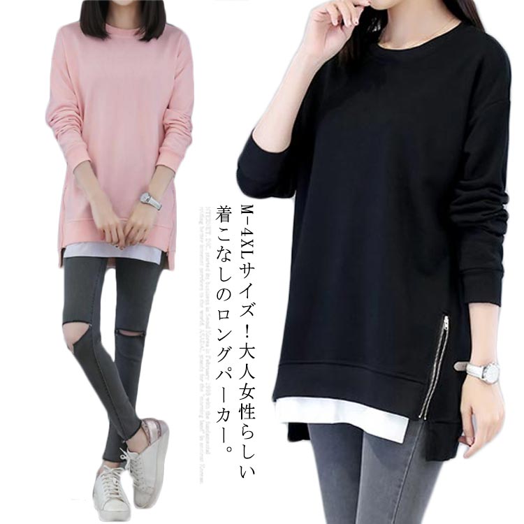 パーカー ロングパーカー レディース スウエット トレーナー プルオーバー ロング丈 サイドファスナー 裾切り替え 春 秋 長袖 トップス ラウンドネック