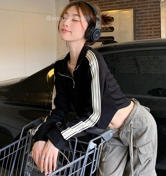 ラインパーカートップス長袖短め短いトレーナースウェットジップアップブラックブラウンダンス衣装ヒップホップレディースガールズ奇抜派手前開き韓国