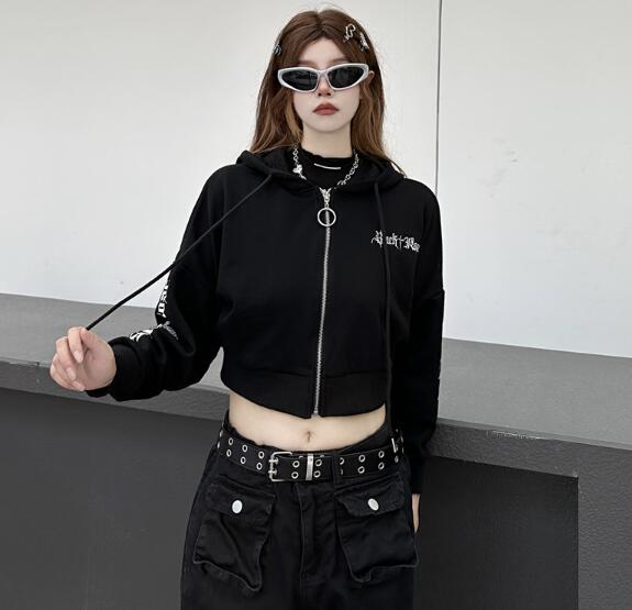 パーカー2色長袖前開き短め短いロゴブラック黒グレージップアップトレーナーチャックトップスカットソーダンス衣装ヒップホップレディースガールズストリートガーリー韓国個性的