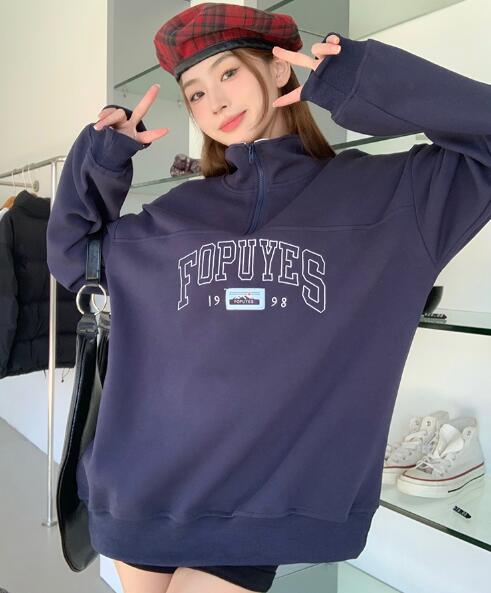 ハーフジップトレーナー2色ロゴジップアップ長袖スウェットトップスカットソー大きいサイズビッグゆったりダンス衣装ヒップホップHIPHOPレディースメンズガールズストリート韓国おしゃれ奇抜派手個性的
