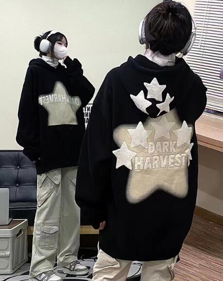 星柄バックプリントパーカートップストレーナースウェット長袖大きいサイズビッグゆったりフーディーポケットダンス衣装ヒップホップレディースメンズガールズストリート奇抜派手韓国大人服おしゃれ