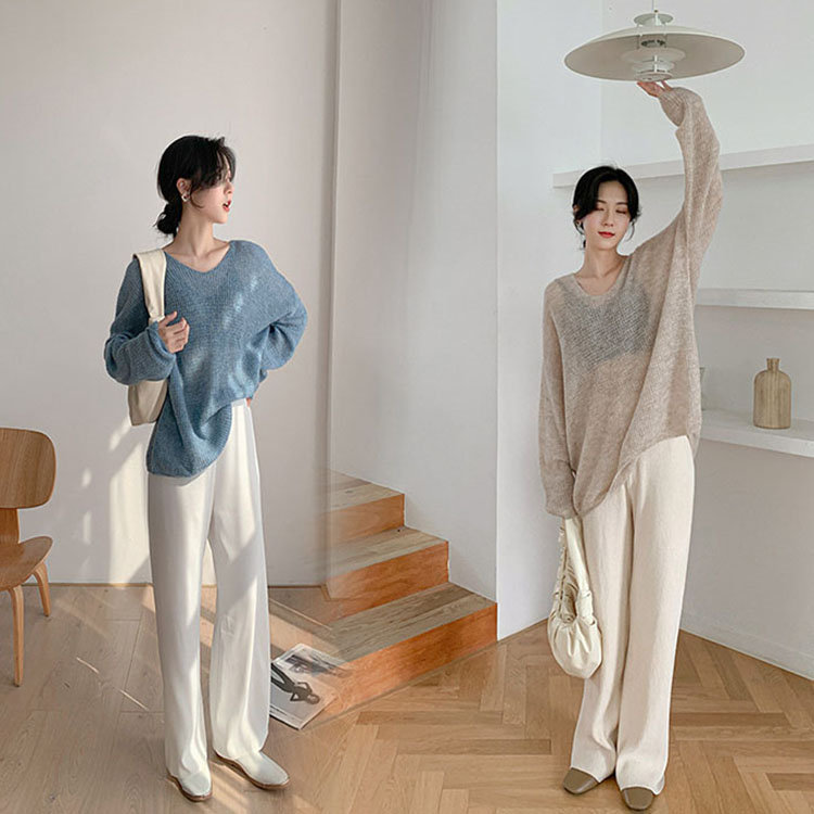 サマーニット レディース 透かしニット 透かし編み 長袖 薄手 ゆったり ゆるニット リブニット トップス プルオーバー 冷房対策