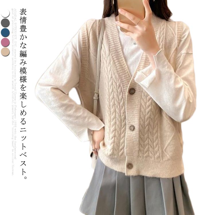 ニットベスト レディース ベスト ニットトップス リブニット ゆるニット トップス 前開き 重ね着 レイヤード 秋新作 ざっくりニット ケーブル編み リブ編み