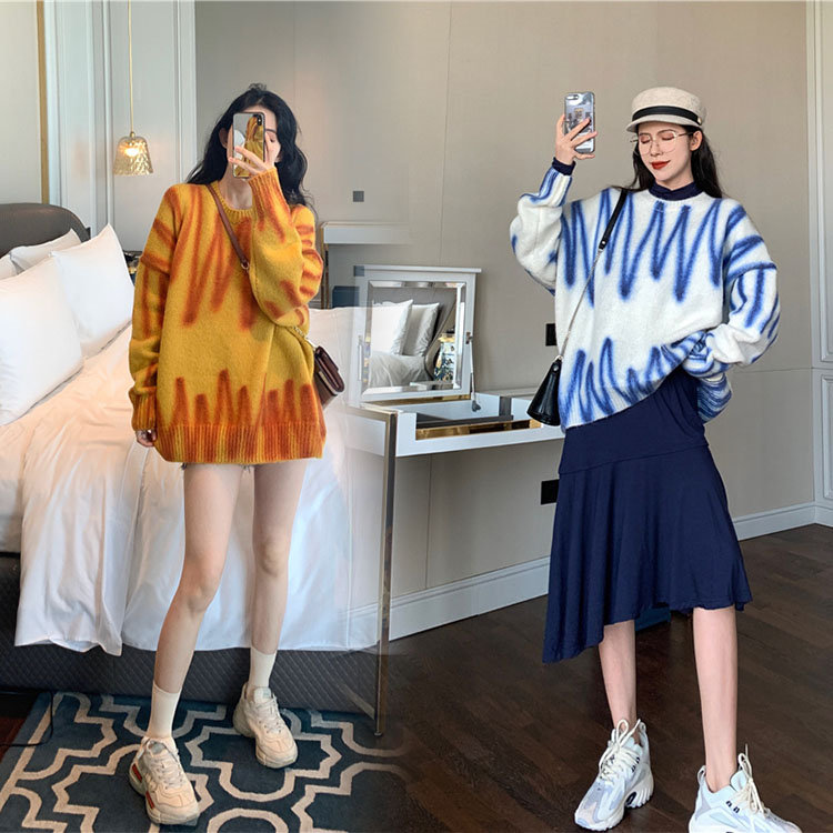 セーター ミディアム レデイース トップス おしゃれ ラウンドネック 幾何柄 カジュアル お出かけ ニット 春秋 長袖 体型カバー 同窓会 普段着 着やせ ゆったり 可愛い ホワイト オレンジ MY-