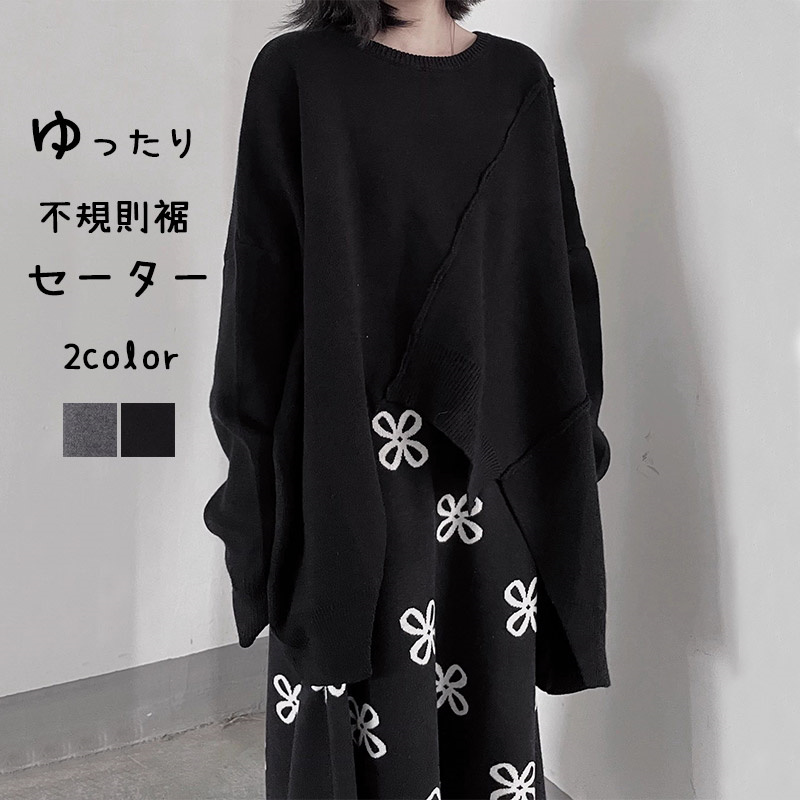 ニットトップス セーター 切り替え ニットプルオーバー ドルマン ゆったりニット ニットチュニック ニット セーター ラウンドネック 不規則裾 防寒