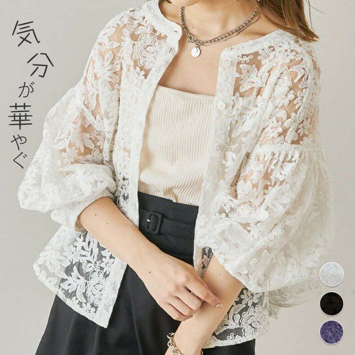 袖ポワン~ 総レース サマーアウター Summer cardigan ホワイト ブラック パーブル 紫 白 黒 フリーサイズ F 20代 30代 40代 50代 プレゼント 贈り物 ギフト 母の日 春