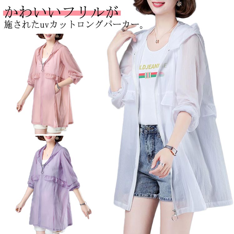 uvカットパーカー ロング丈 接触冷感 uvカットパーカー UVパーカー フリル uv対策 シアーシャツ おしゃれ 20代 30代 大人可愛い