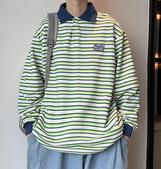 ボーダーポロトレーナー2色ポロシャツ長袖シャツトップスロゴ刺繍カラフル大きいサイズビッグ長めダンス衣装ヒップホップレディースメンズストリート個性的奇抜韓国おしゃれポロネックブラウングリー