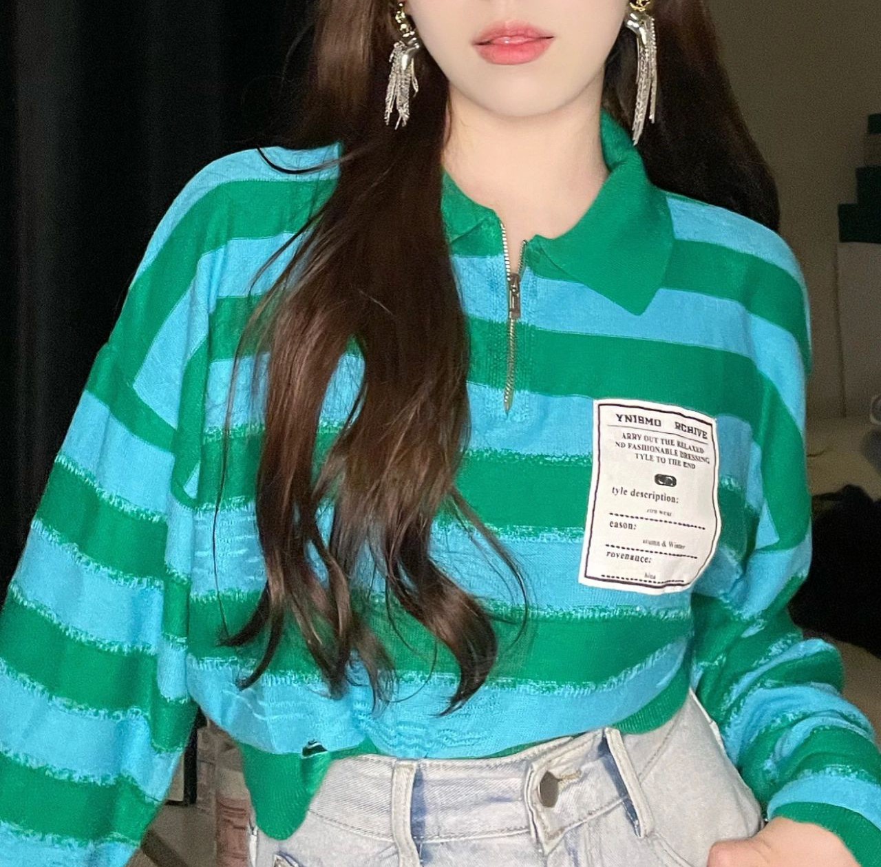ボーダーポロシャツ長袖ジップアップハーフジップショート丈短い短めへそ出しタグトップスカットソーTシャツトレーナーダンス衣装ヒップホップHIPHOPレディースガールズストリート個性的奇抜派手スケーターロ