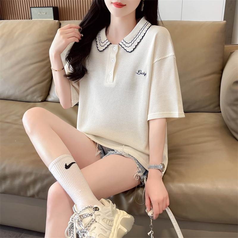 レディース トップス ポロシャツ ミドル丈 半袖 5分袖 襟付き 襟刺繍 ワイド ストレート かわいい 大人可愛い きれいめ シンプル カジュアル おしゃれ ラフ メンズライク ガーリー