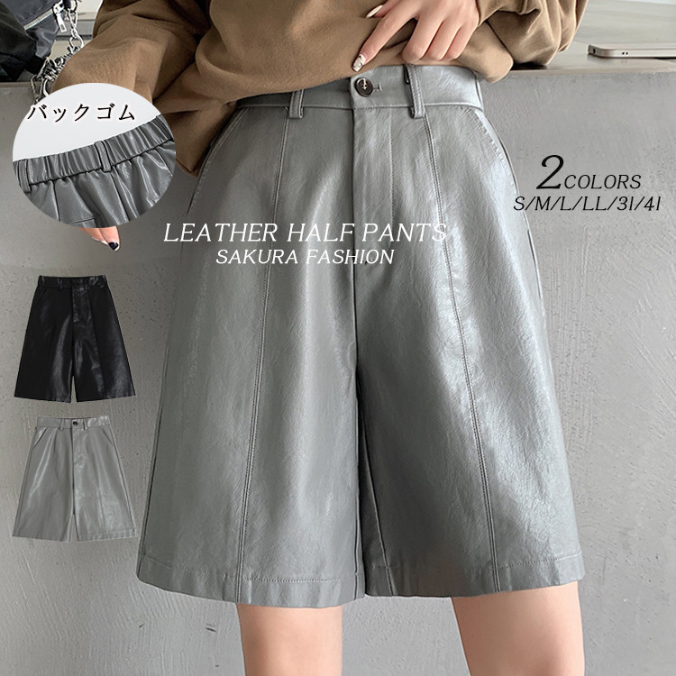 パンツ フェイクレザー レディース ボトムス ズボン 半ズボン 短パン ショーパン ショート丈 膝上 ひざ上 ハーフパンツ ミニ丈 短め レザーパンツ ウエストゴム