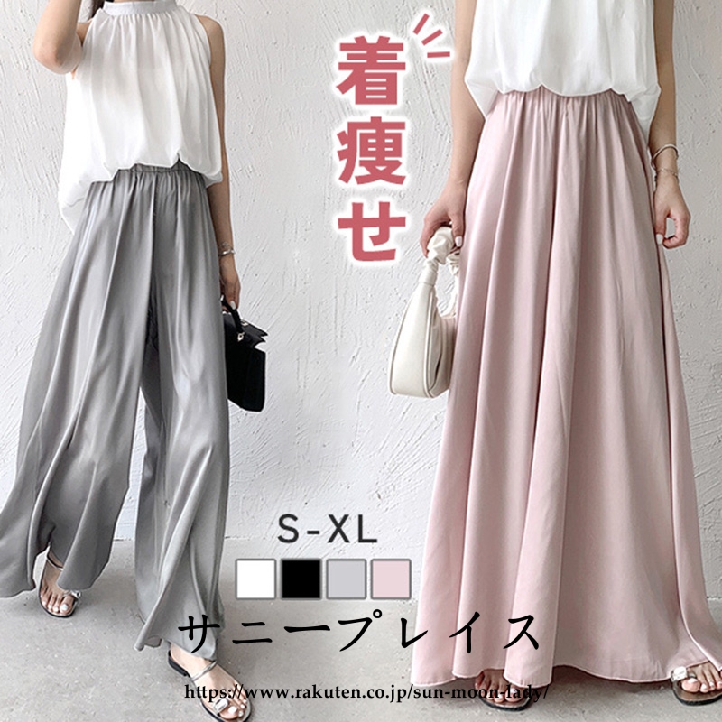 ワイドパンツ サテン レディース ロング パンツ ウエストゴム 無地 春 夏 秋 薄手 軽い お洒落 シンプル ブラック ホワイト グレー ピンク ルームウェア 着痩せ 細見え 快適