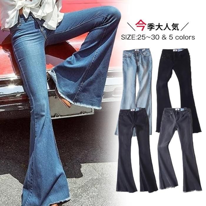 デニムパンツ レディース ラッパデニムパンツ ブーツカット フレイドヘム 切りっぱなし カットオフ ロング ストレッチ 黒 グレー ブルー 春服 ジーンズ パンタロン ラッパズボン ジーパン