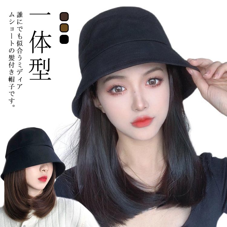 レディース キャップ 脱毛症 かつら つけ毛 エクステ ショート 髪付き帽子 ブラック ウィッグ付き帽子