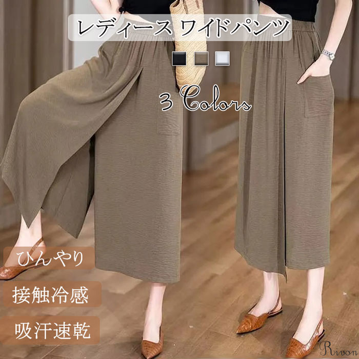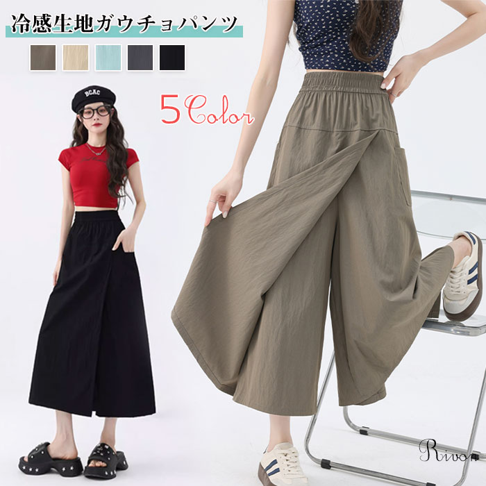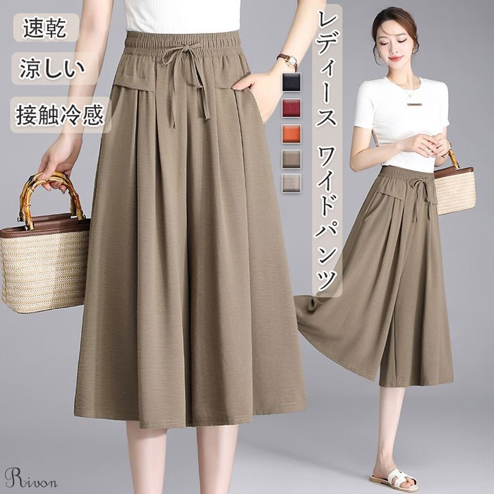 着回し力抜群のハイウエストガウチョパンツの登場です ガウチョパンツレディース七分丈は吸汗速乾素材で作られており、さらに夏に嬉しい接触冷感とケア機能付き