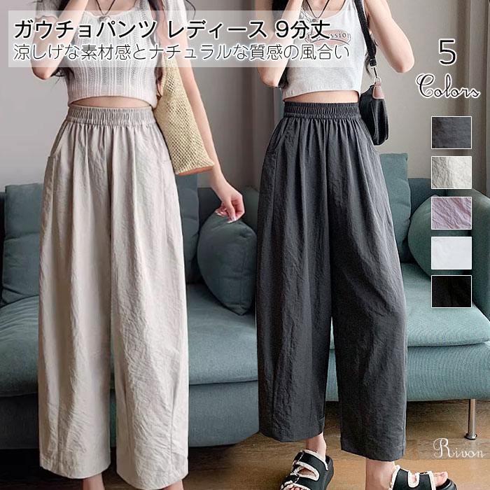 ワイドパンツ レディース ボトムス ガウチョパンツ ポケット付き 9分丈 ゆったり ロング 春 夏 秋 ウエストゴム
