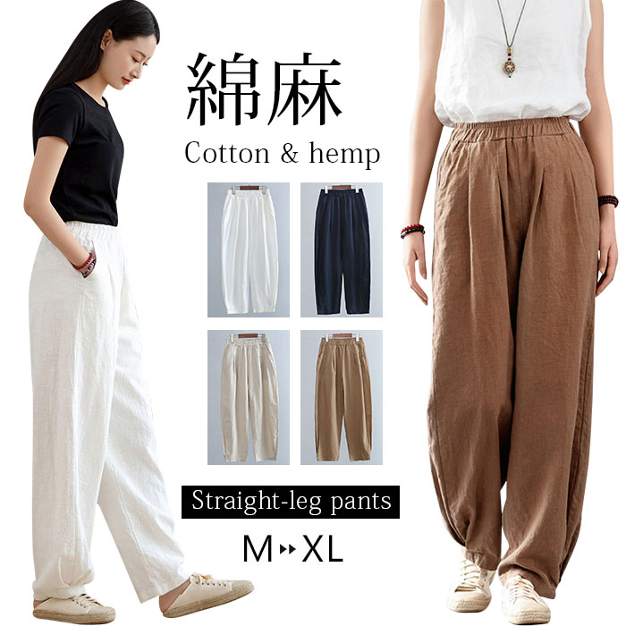 リネンパンツ レディース イージーパンツ サルエルパンツ 綿麻 ゆったり 新品 スラックス きれいめ クロップドパンツ ウエストゴム テーパードパンツ 無地 おしゃれ スリット入り カジュアル 心地よ