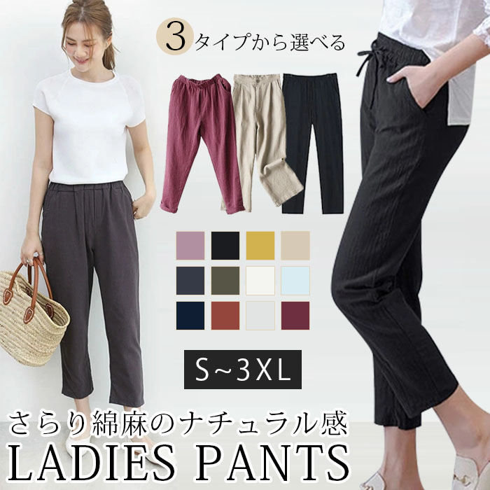 レディース パンツ 春 秋 夏 長ズボン 綿麻混 十分丈 ワイドパンツ ボトムス デニム 軽い 美脚 無地 大きいサイズ ゆったり ベーシック 体型カバー カジュアル ウエストゴム -057