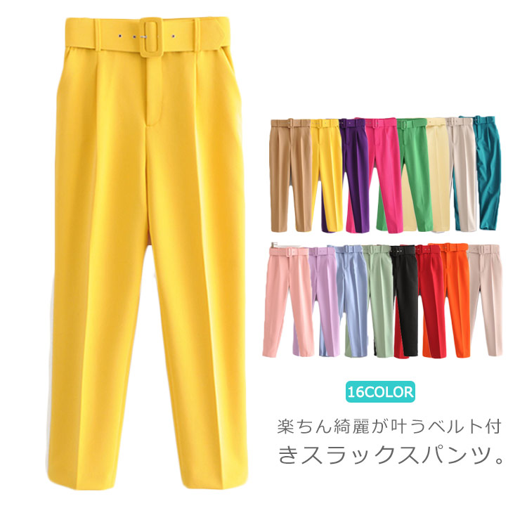 スラックスパンツ スラックス ロングパンツ オフィスカジュアル ボトムス タック 美脚 ベルト付き ハイウエスト