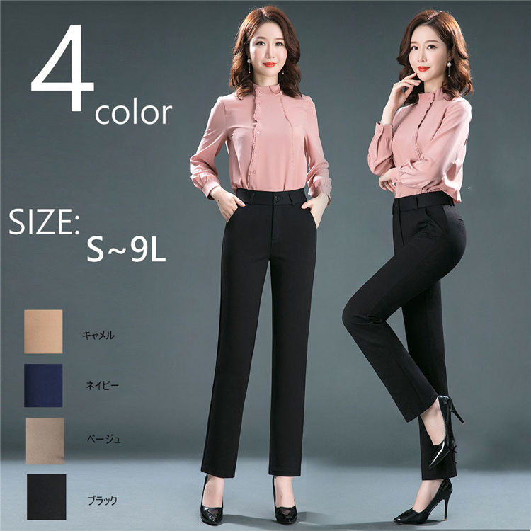 レディース パンツ 春 秋 十分丈 長ズボン ボトムス 美脚 無地 大きいサイズ 脚長効果 ブラック ネイビー キャメル ベージュ ストレッチ エレガント ベーシック 体型カバー -047