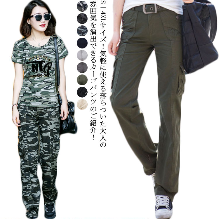 -4サイズ カーゴパンツ レディース 綿 迷彩 ミリタリーパンツ ワークパンツ チノパン ストレート 大きいサイズ 無地 春 夏 秋 軍パン
