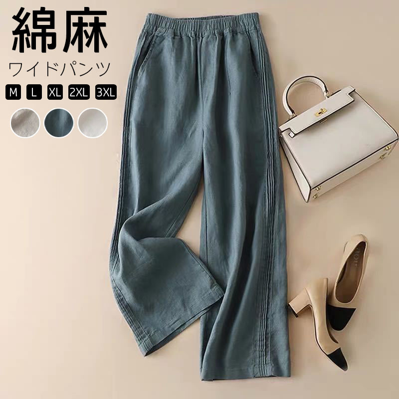 リネン ワイドパンツ ウエストゴム レディース 麻 サイドポケット ゆったり ナチュラルパンツ ヴィンテージリネン M L 3XLサイズ 春 夏秋 体型カバー ボトムス 大きいサイズ