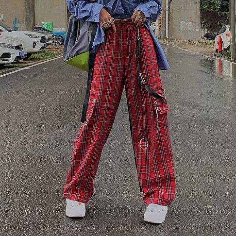 パンツ ズボン 切り替え バイカラー 配色 体型カバー チェック柄 格子柄 ヒップホップ 原宿系ファッション 韓国風 ダンス衣装 カワ 個性 奇抜 かわいい 青文字系 ボトムス
