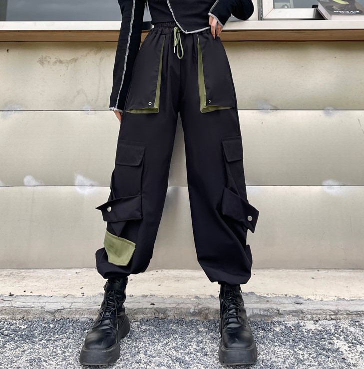 全2色 パンツ ズボン ハイウエスト 切り替え 体型カバー 大きいサイズあり 原宿系ファッション 韓国風 ダンス 衣装 ダンサー ヒップホップ 個性 奇抜 かわいい 青文字系 ボトムス