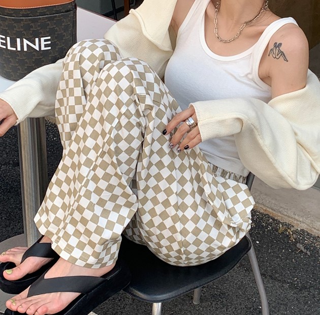 チェックパンツ2色ズボンボトムスロングジャージゴムストレートハイウエスト黒ブラックベージュダンス衣装ヒップホップHIPHOPレディースメンズガールズ大人ストリートゆったり太いワイド韓国おしゃれ柄パンツ