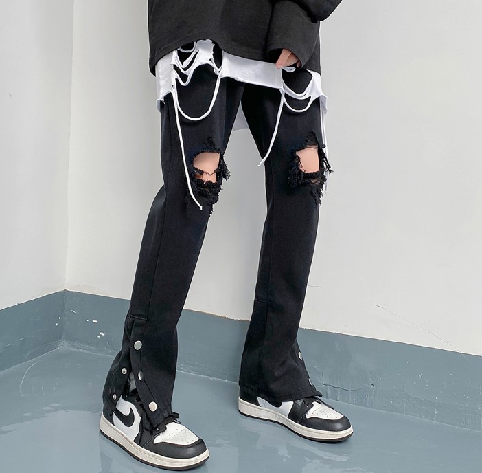 ダメージブラックデニムジーンズジーパンパンツズボンボトムススキニーボタン黒無地シンプルストレートロング細いダンス衣装ヒップホップHIPHOPレディースメンズガールズストリート個性的奇抜韓国美脚クラッシ