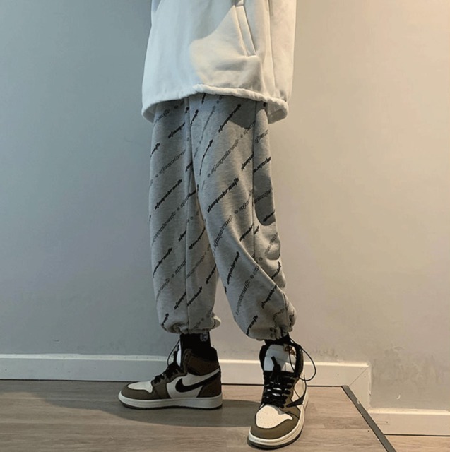 ロゴスウェット2色ジャージズボンボトムスパンツゴムロングジョガーパンツ絞りハイウエスト太いワイド総柄黒ブラックグレー大きいサイズビッグゆったりダンス衣装ヒップホップHIPHOPレディースメンズガールズ