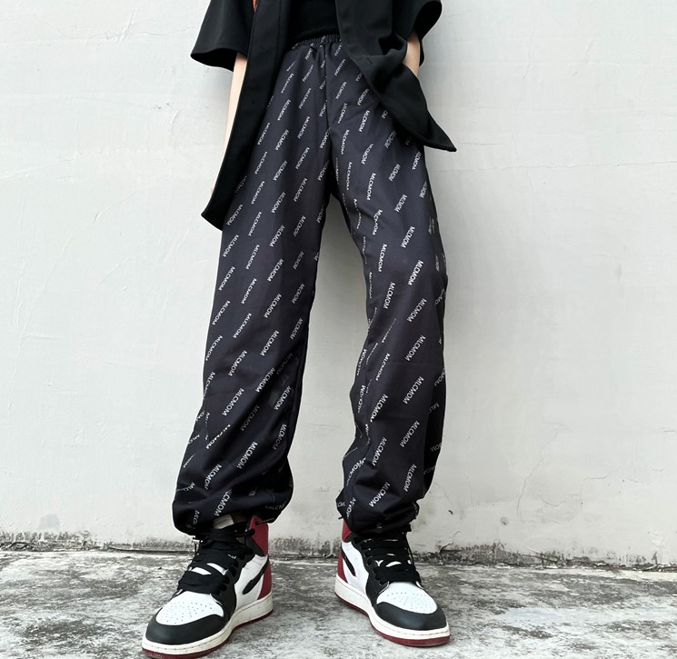 ロゴ総柄パンツズボンボトムスジャージ服下ゴムハイウエストロングジョガーパンツ黒ブラックダンス衣装ヒップホップHIPHOPレディースメンズガールズストリート動きやすいスポーツ練習着奇抜派手個性的韓国